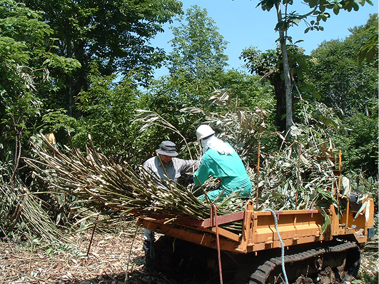 チシマ笹の採取は6~10月、夜明け前の暗いうちに山へ入り、一本一本をナタで手作業で刈り取ります。日が昇ると笹が蒸れてしまうため、作業は午前10時までに終了。